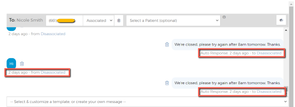 When the number is disassociated, that will be displayed under the text messages to and from that number as seen below.