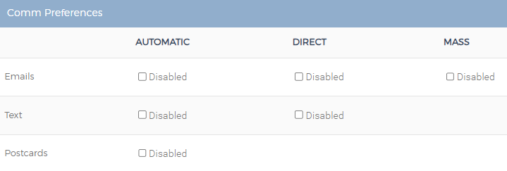 Communication Preferences: This field allows you to view and edit the communications preferences of a client. If you make an edit to these preferences for the client, be sure to click the green “Save” button on the right-hand side.