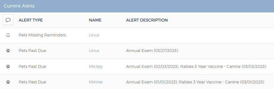 Current Alerts: This section gives you a full picture of what alerts are on file for the client and their pets.