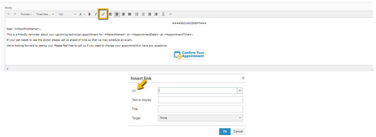 You can add a link to an email by highlighting the image or words you would like to add the link to, and in the toolbar of the body of the email click the insert/edit link button to the right of your Italicize button. You can then add your URL there.