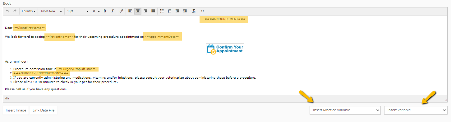 You can use variables in your communications to automatically pull information into a text/email. Any available variables will be in the Insert Variable drop-down box at the bottom right corner of the email. The drop-down menu that says Insert Practice Variable contains variables that will auto-fill information that pertains to the practice itself. The drop-down menu that says Insert Variable contains variables that will auto-fill information that pertains to the appointment, the client, and the patient.