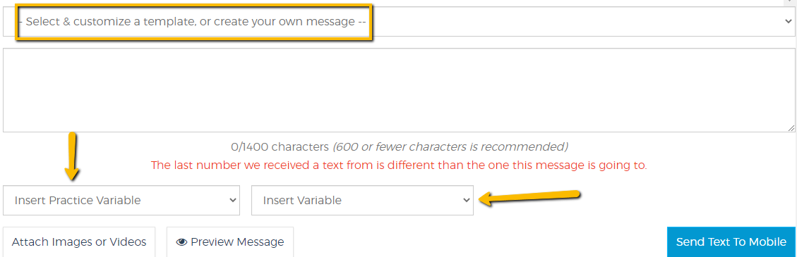 - Variables can be used from the “Insert Variable” drop-down to include a patient or client name in the text message.