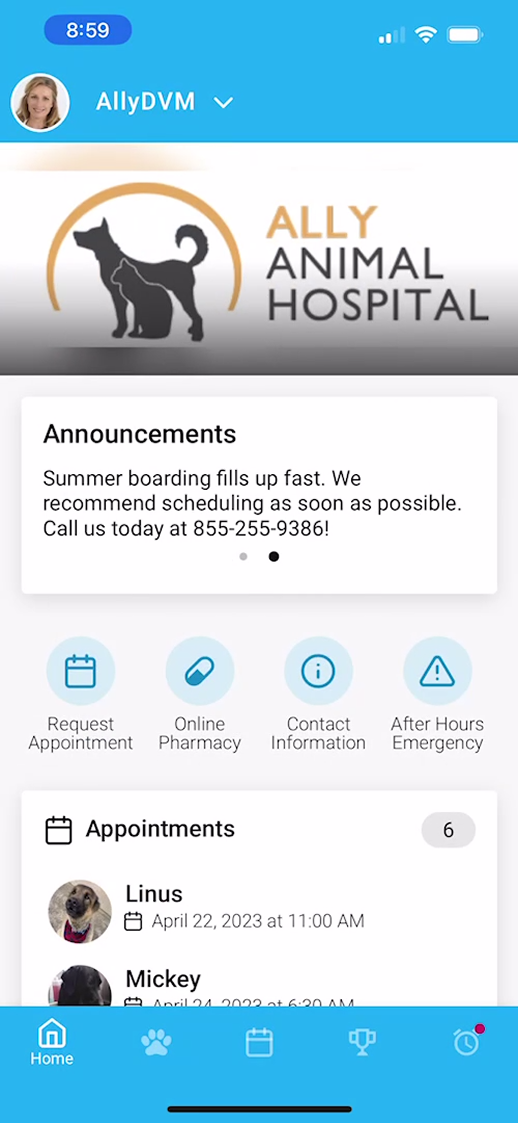 - Pet Parents with email on file with multiple hospitals can now easily switch between without logging out! After signing up for each location, click the caret next to the hospital name to easily and conveniently switch.