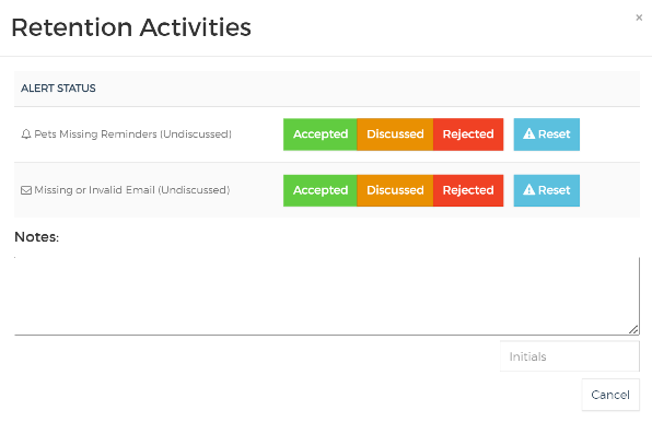 The Retention Calendar Activities are best used to either show that a client denied services (by turning the alert red) or that a conversation was had with the client - maybe they are planning to bring in the records at their appointment so reminders can be updated (by turning the alert orange). The Retention Calendar Activities is used as an internal method of communication among staff members and does not count towards satisfying alerts.