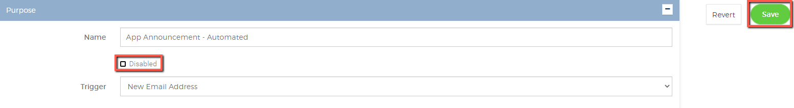 When you are ready to enable this automatic communication to start sending, uncheck the "Disabled" box and click save.