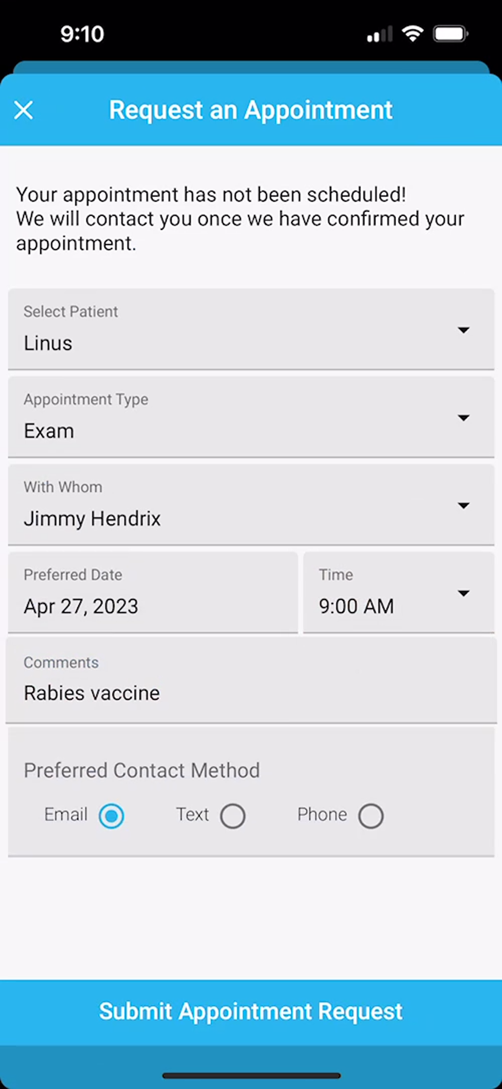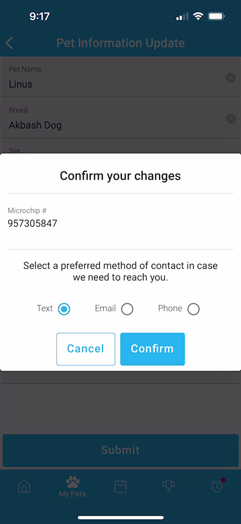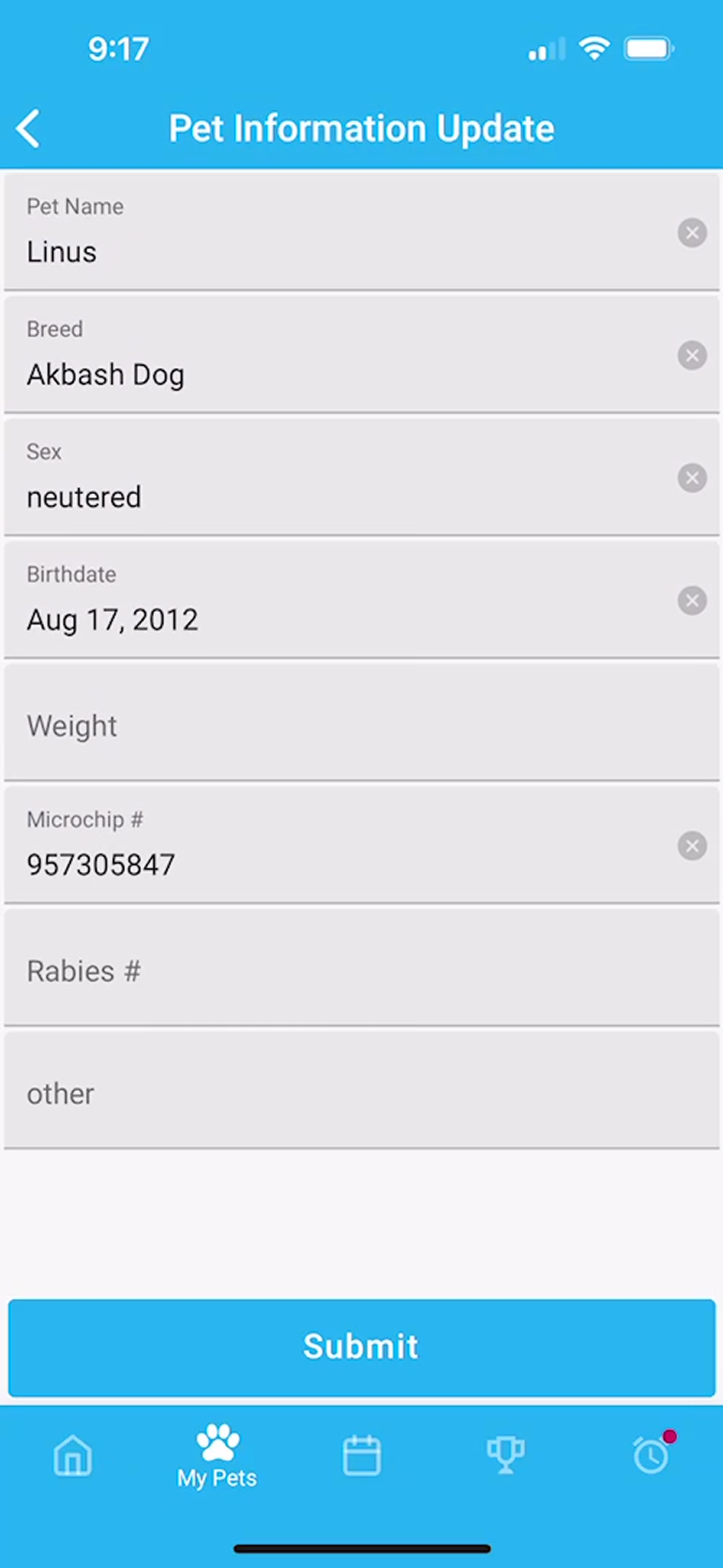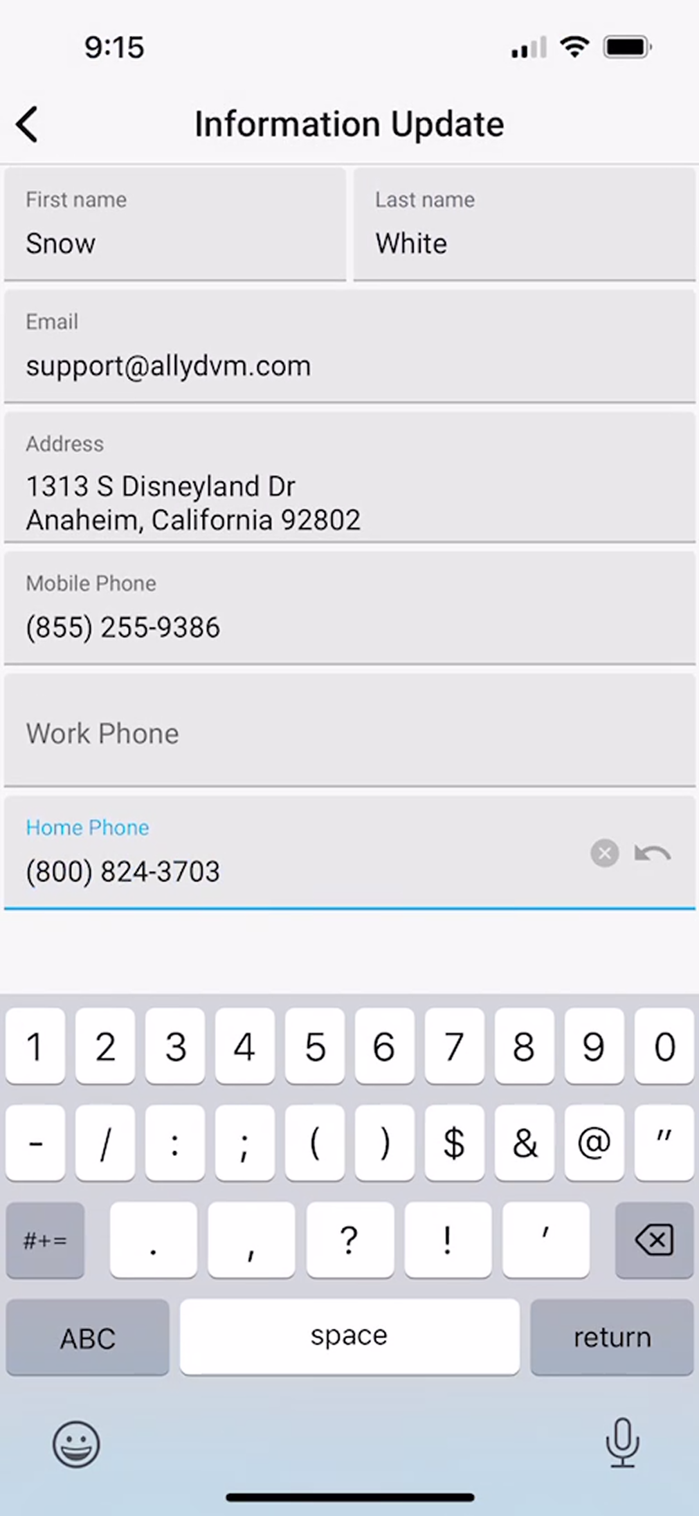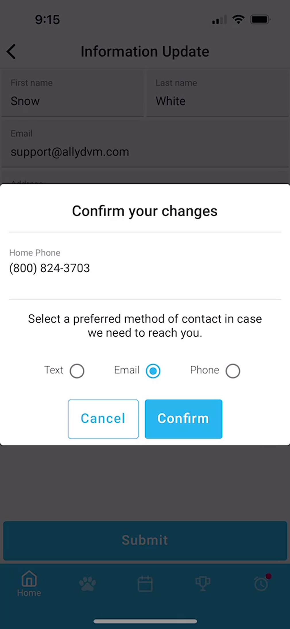 - From the Patient Profile, after clicking "Request Information Update" the Pet Parent can update all the necessary fields and click submit. After clicking submit, only fields that were updated are sent to your hospital.