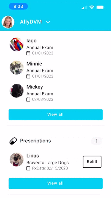 - The Pet Parent clicks refill next to the prescription they need to refill, and PetPage does all the work to populate the form.